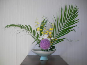 6月12日(火)に開催した華道部は、オンシジューム、ギガンジューム、アレカヤシと白のスプレー菊を使って活けました