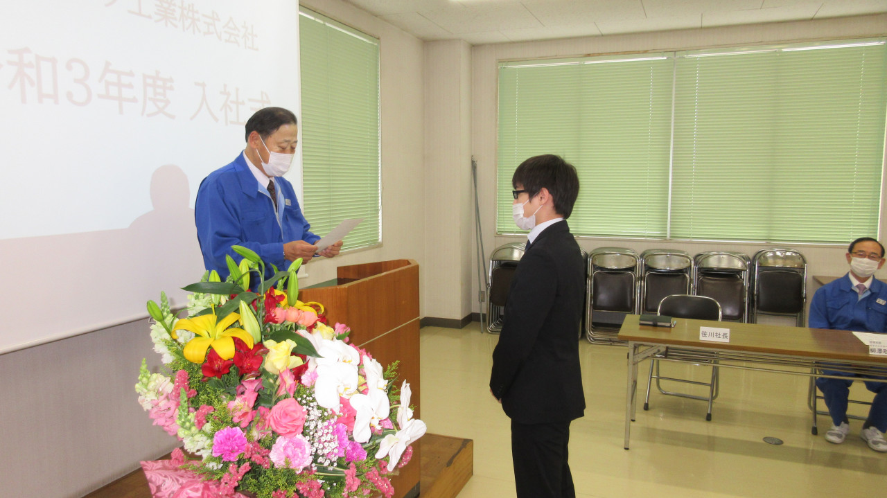 桜満開の便りとともに、本日、令和3年度新規学卒者4名の入社式が開催されました。